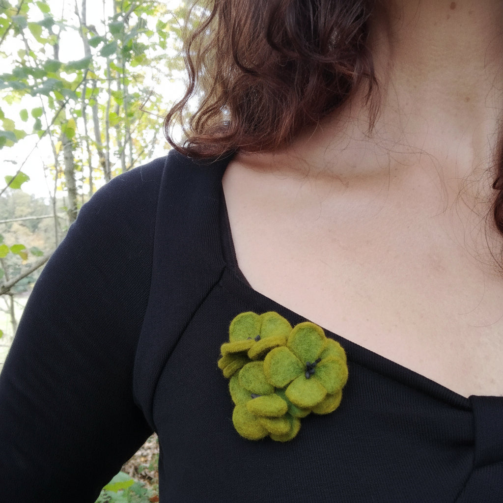 Jolie bamroche fleur composée de trois fleurs de cerisier en laine verte.