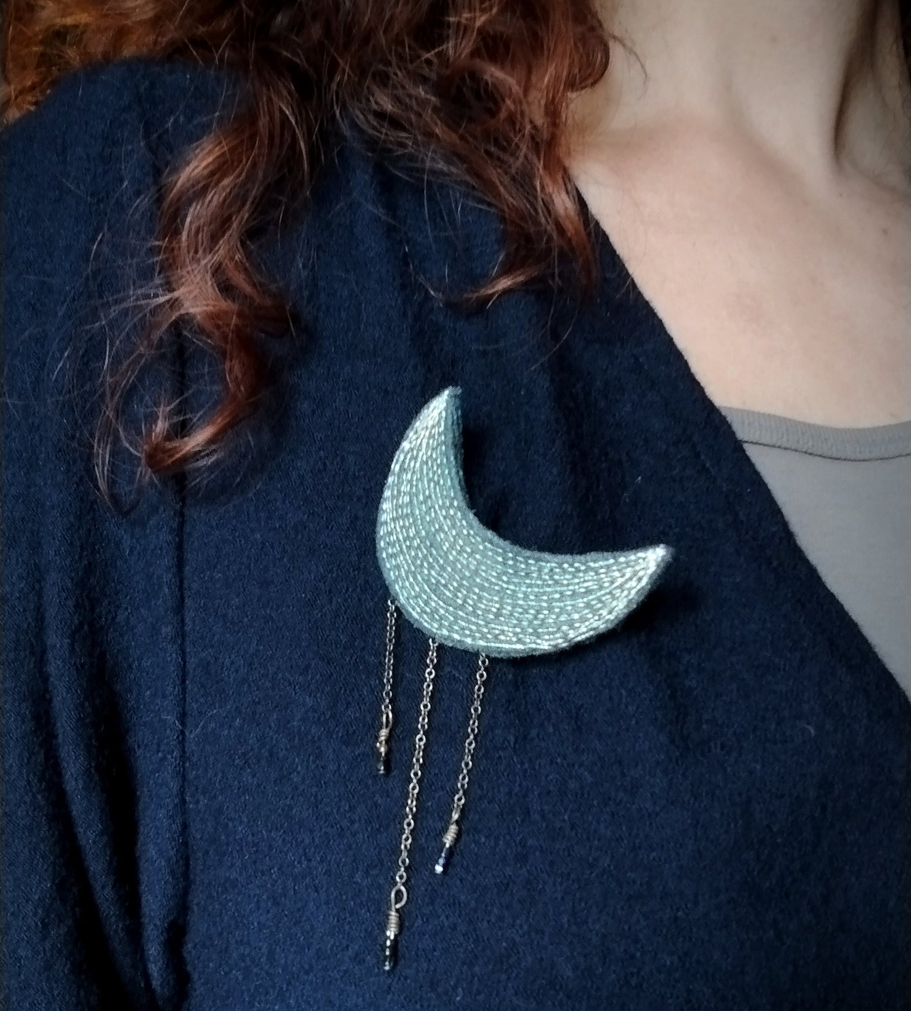 La broche lune est surpiquée de filaments dorés qui éclairent la laine selon les variations de la lumière.