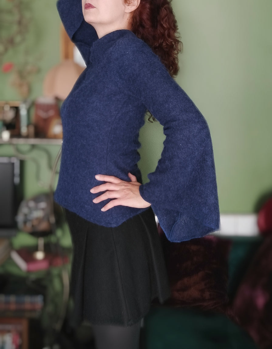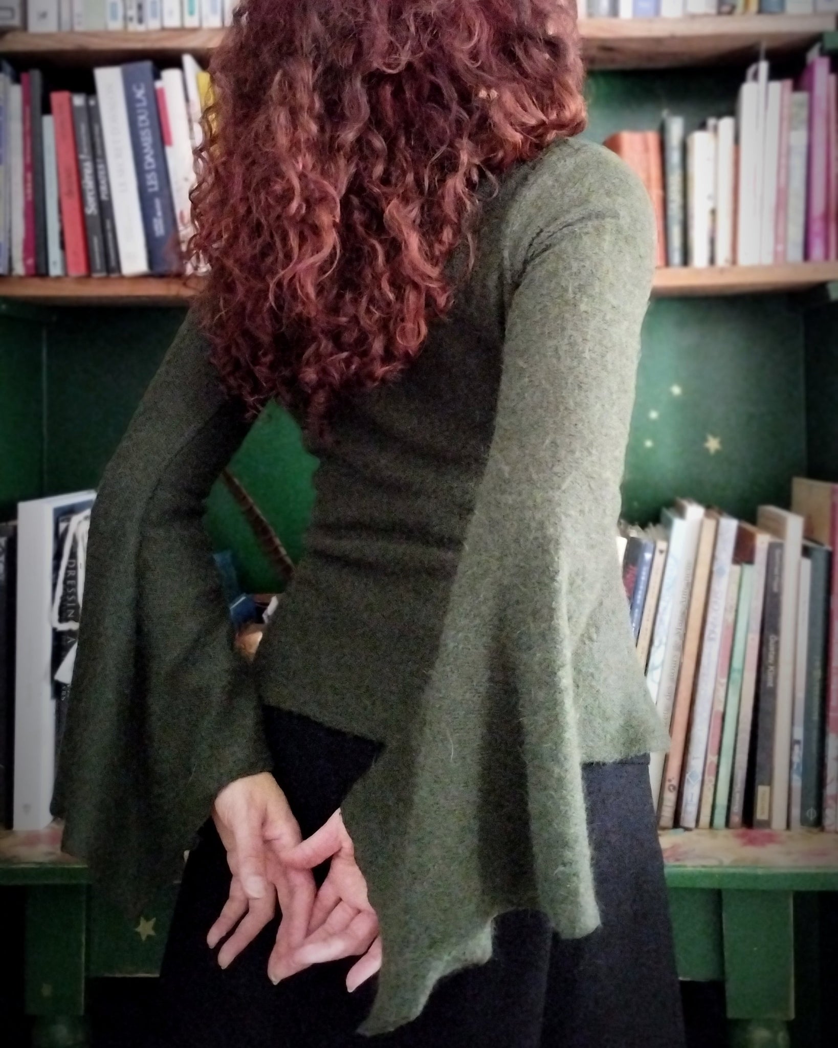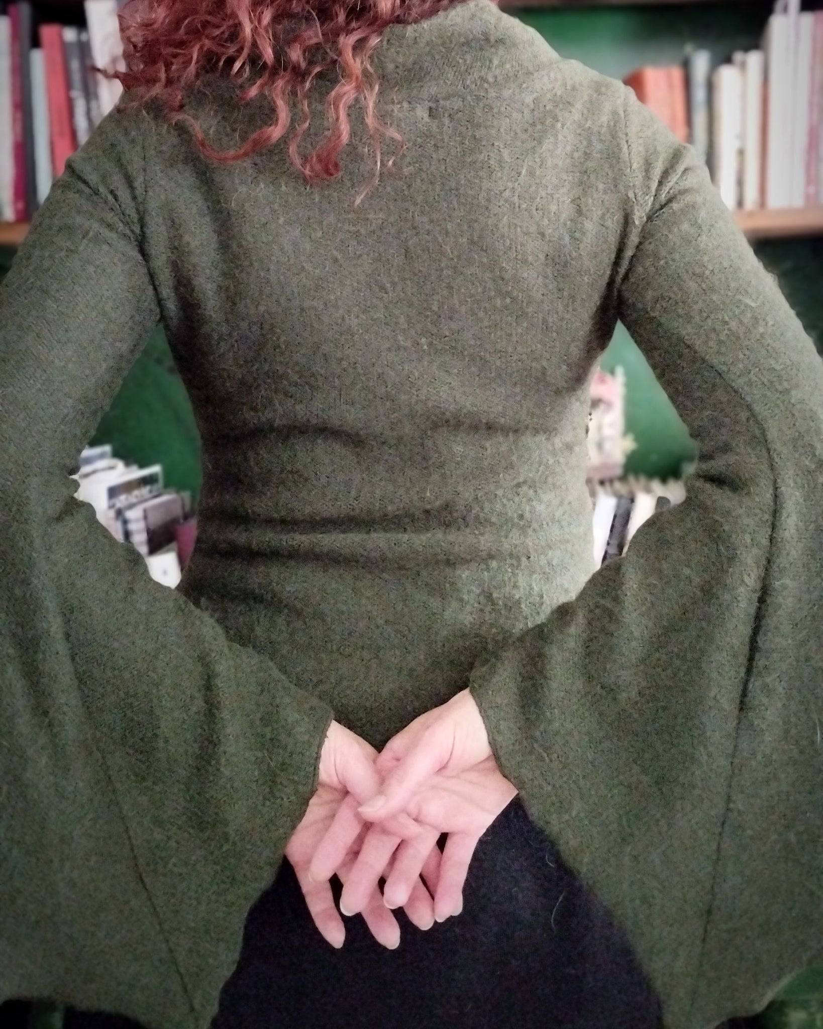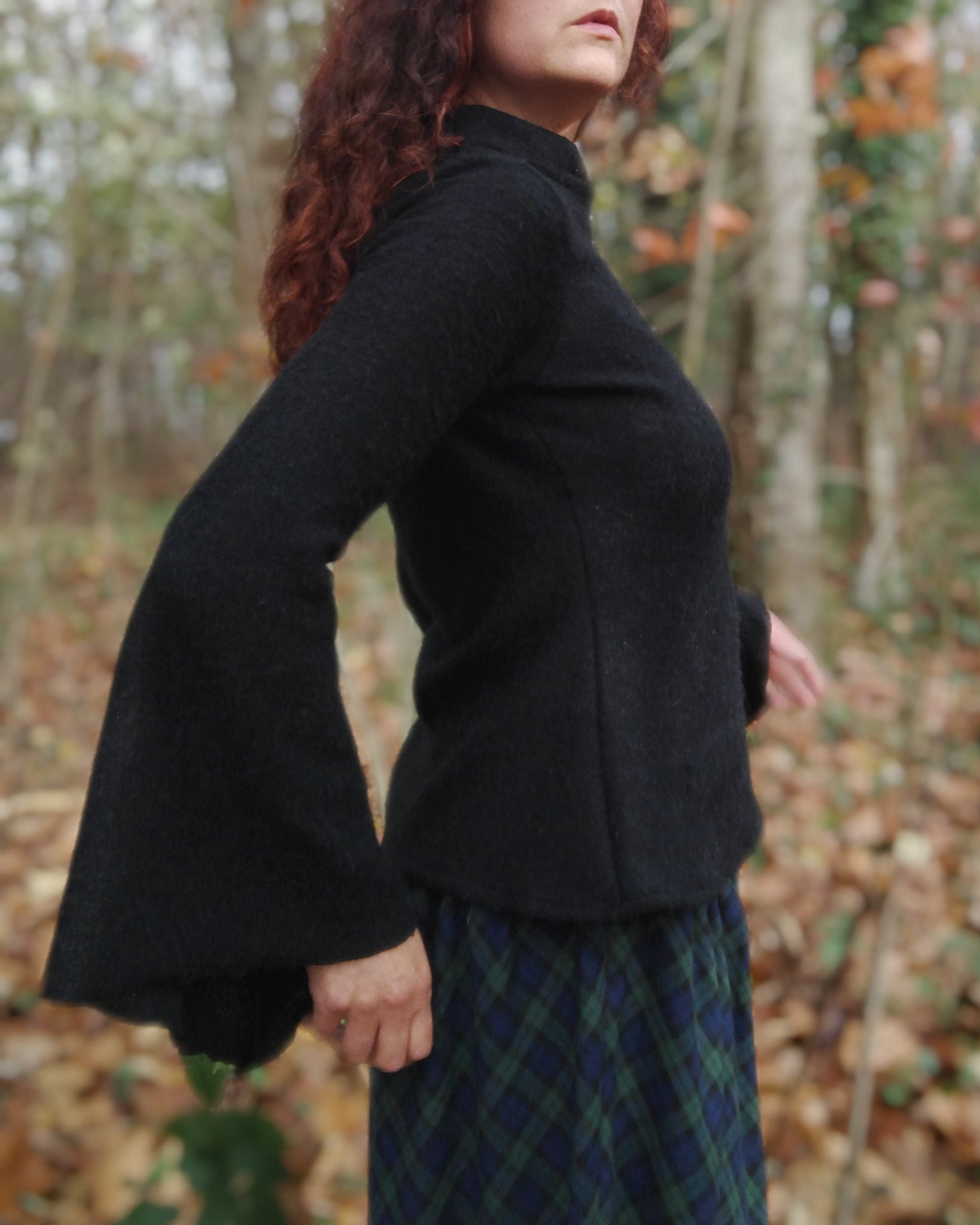Pull cintré très doux et chaud à grandes manches médiévales, son encolure est finie d'un élégant et chaud col croisé.