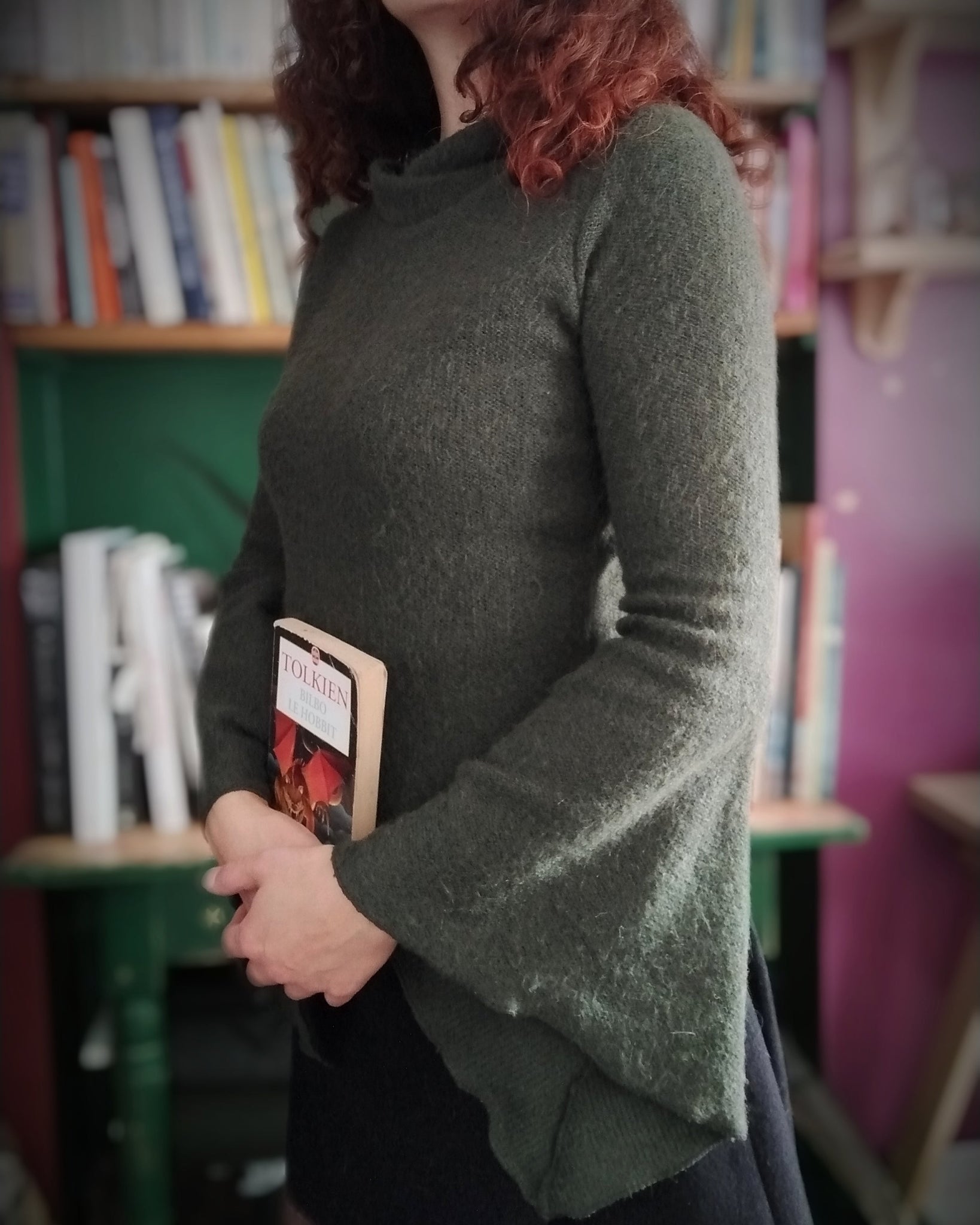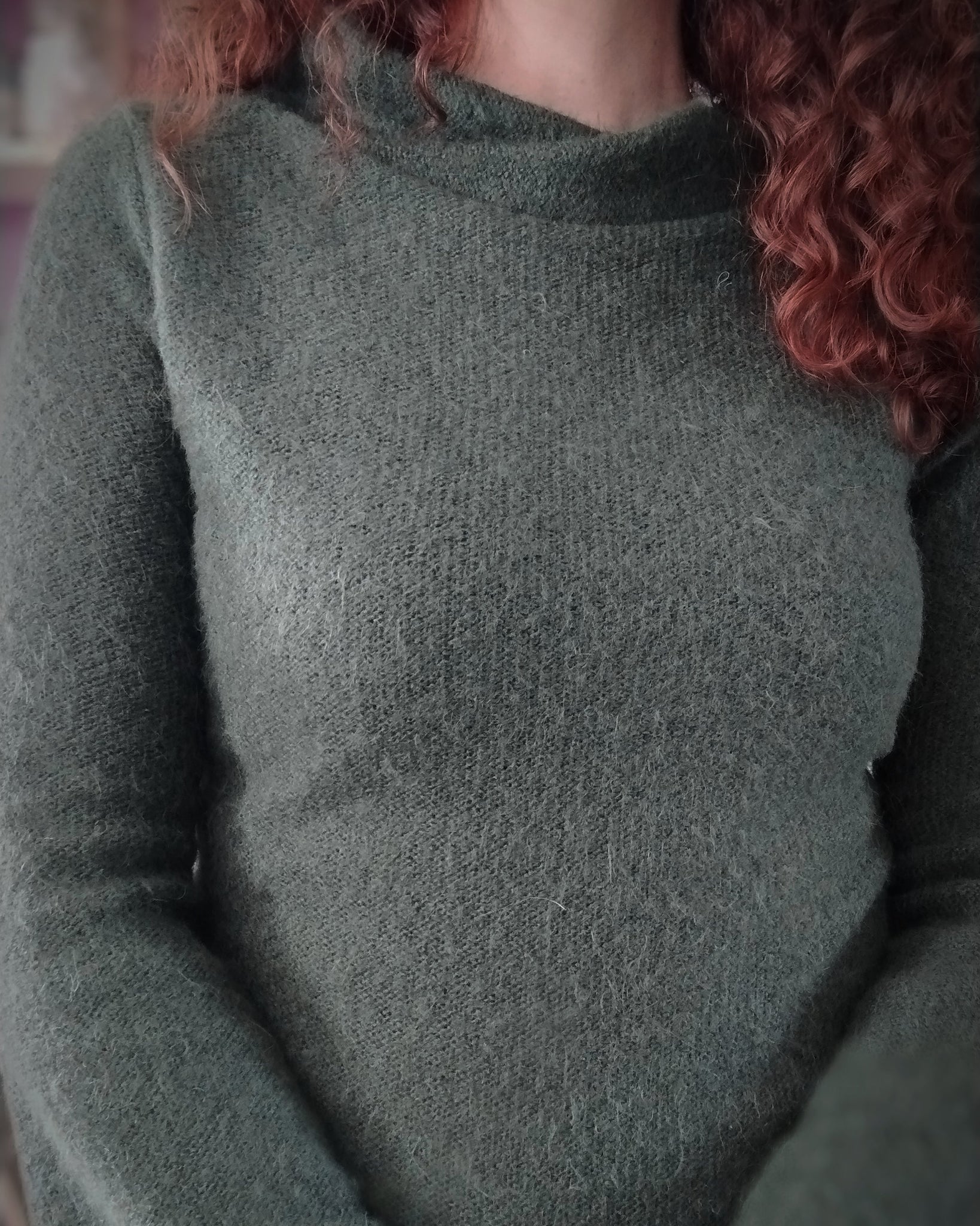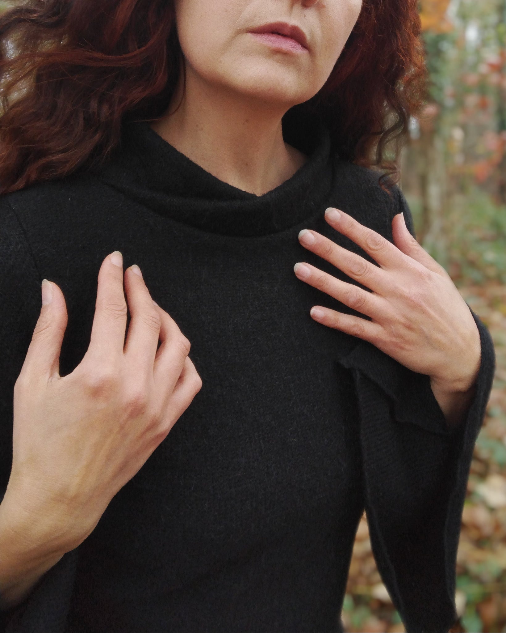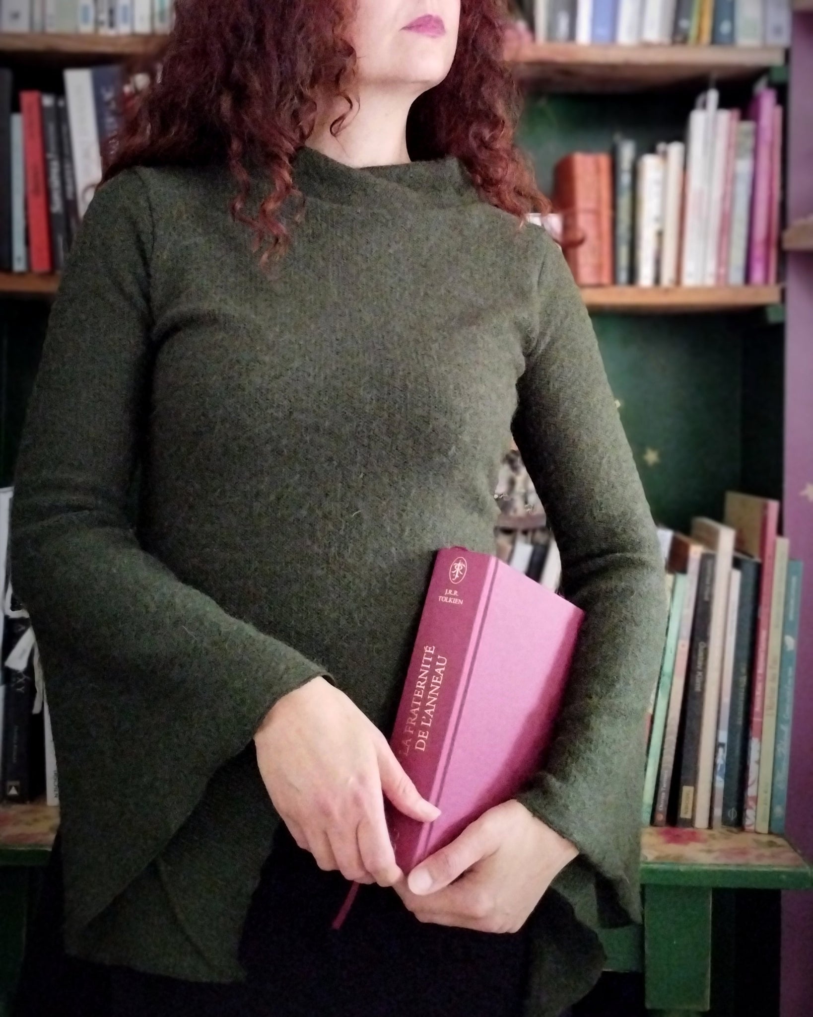 Pull cintré très doux et chaud à grandes manches médiévales, son encolure est finie d'un élégant et chaud col croisé.