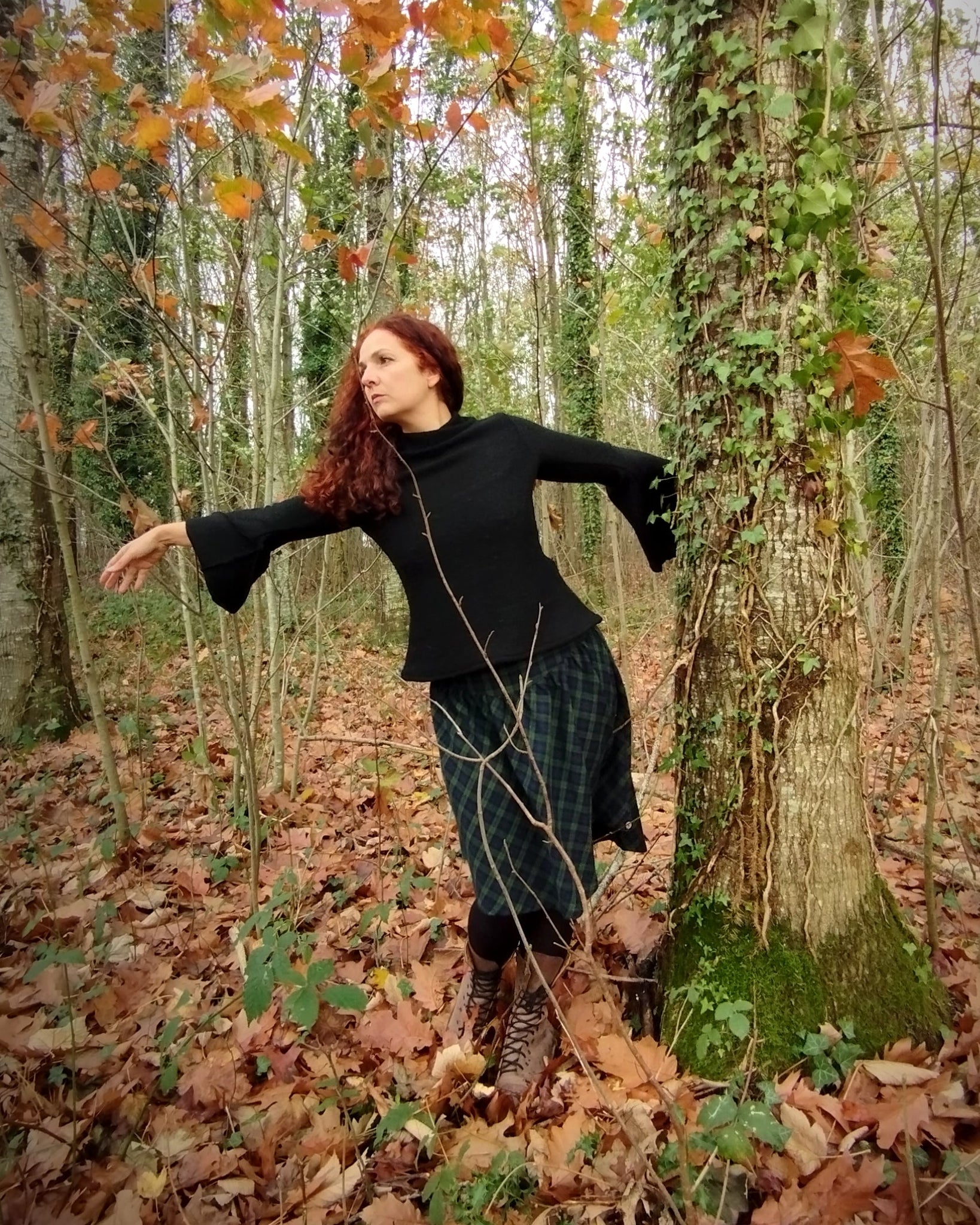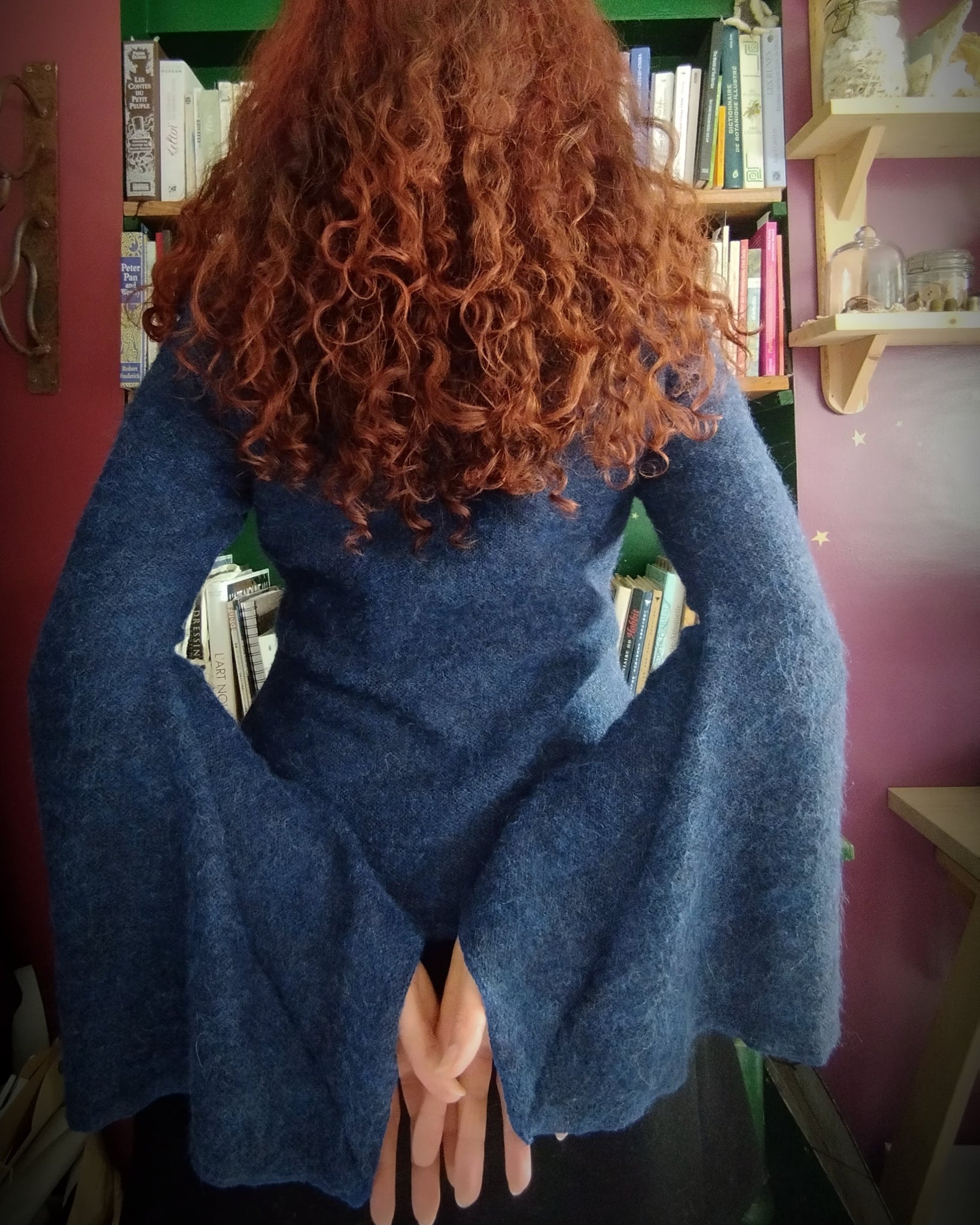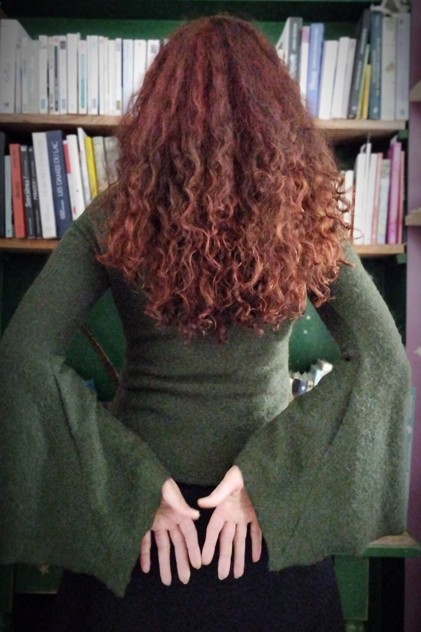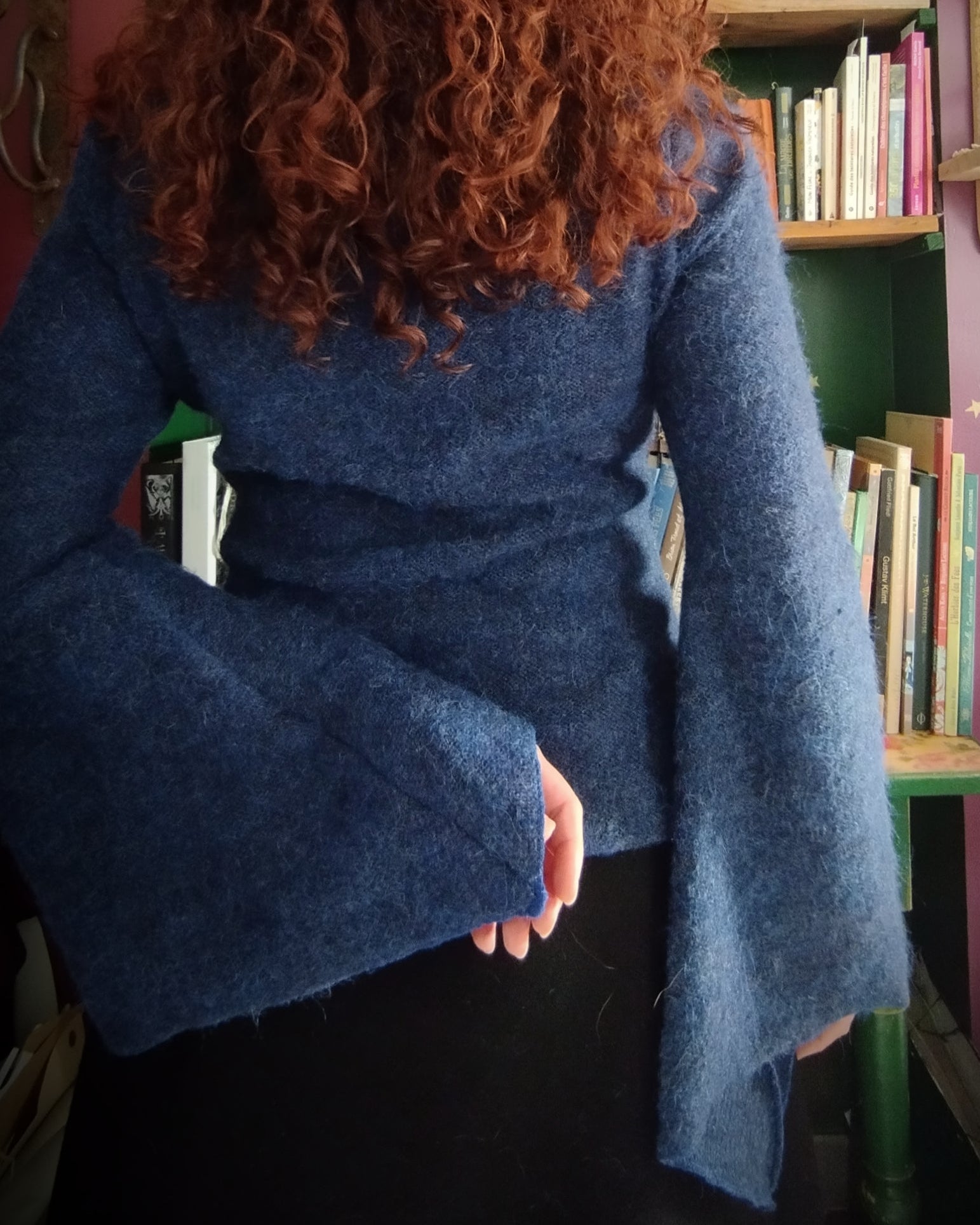 Pull cintré très doux et chaud à grandes manches médiévales, son encolure est finie d'un élégant et chaud col croisé.