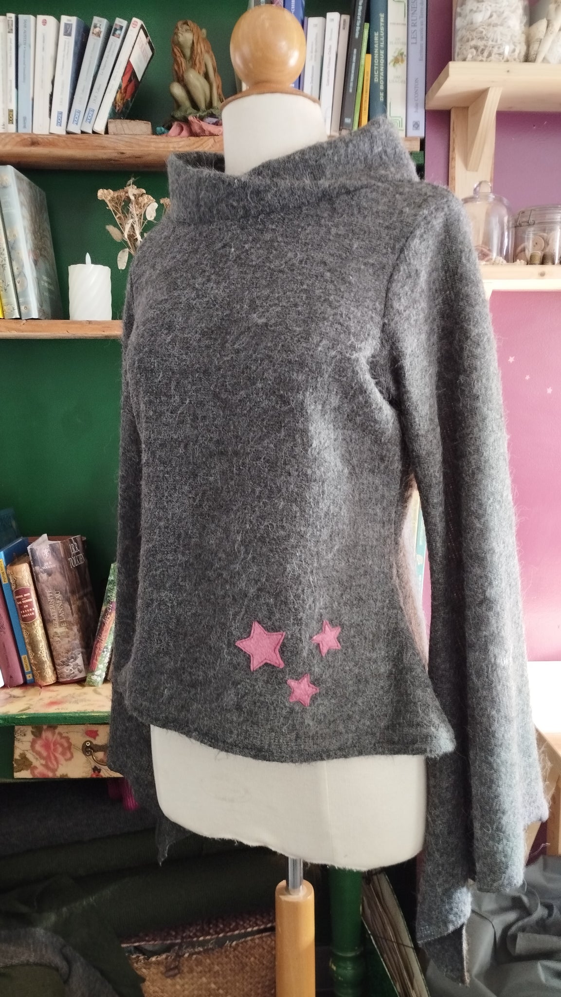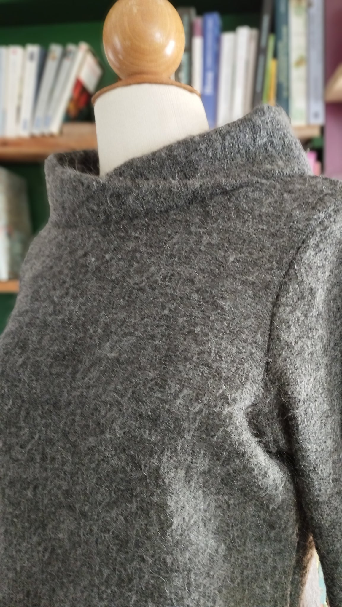 Pull cintré très doux et chaud à grandes manches médiévales, son encolure est finie d'un élégant et chaud col croisé.
